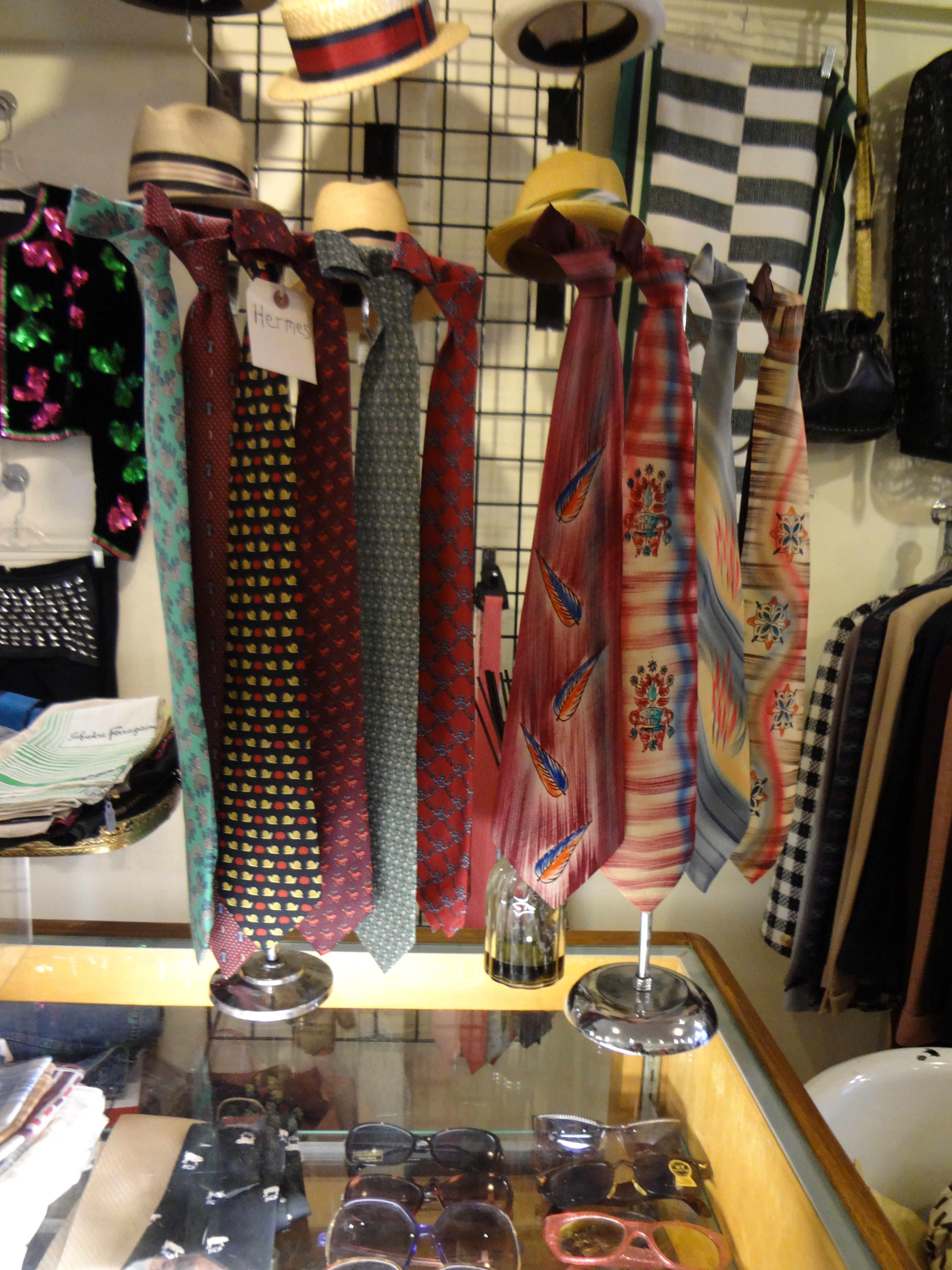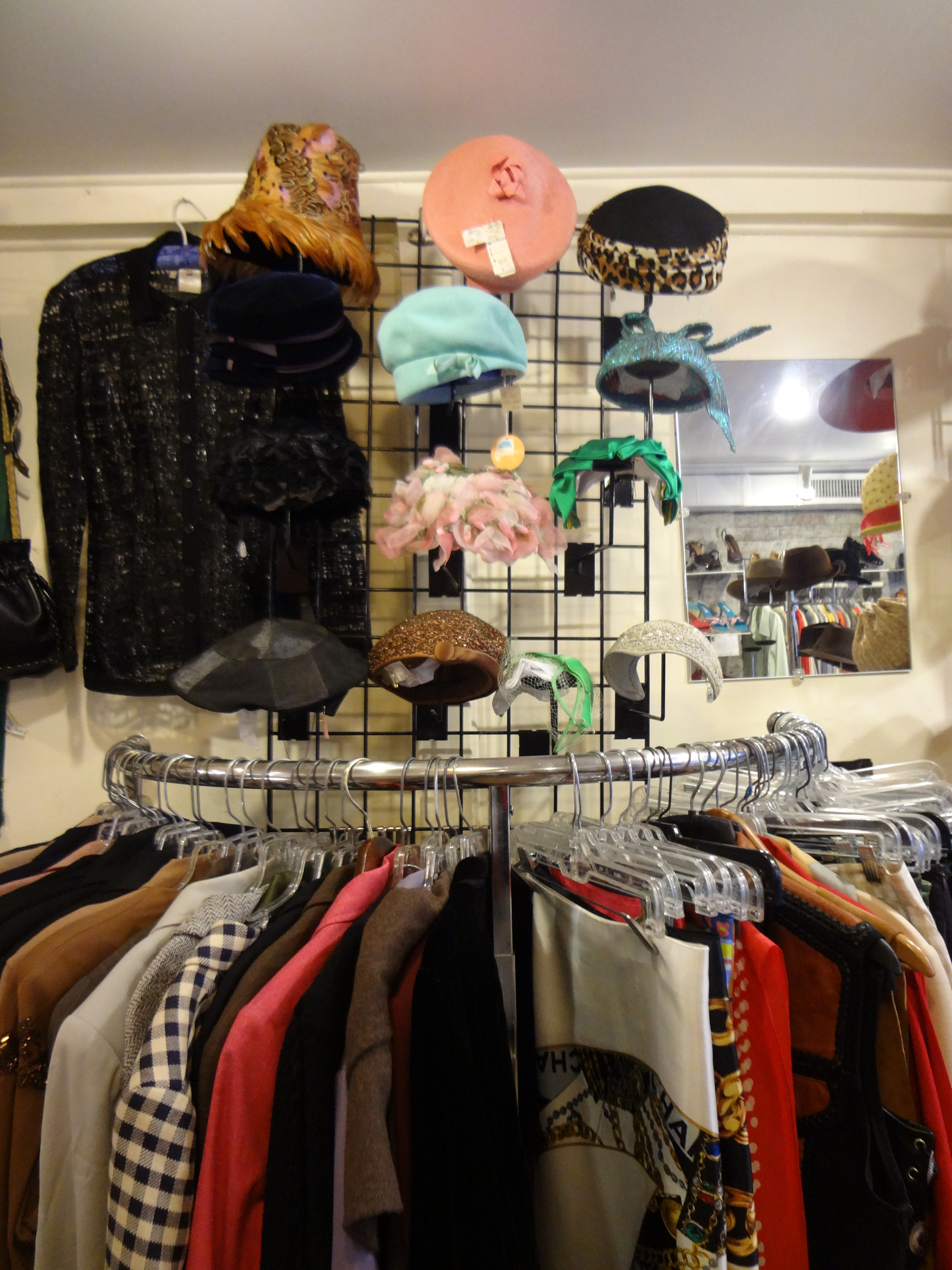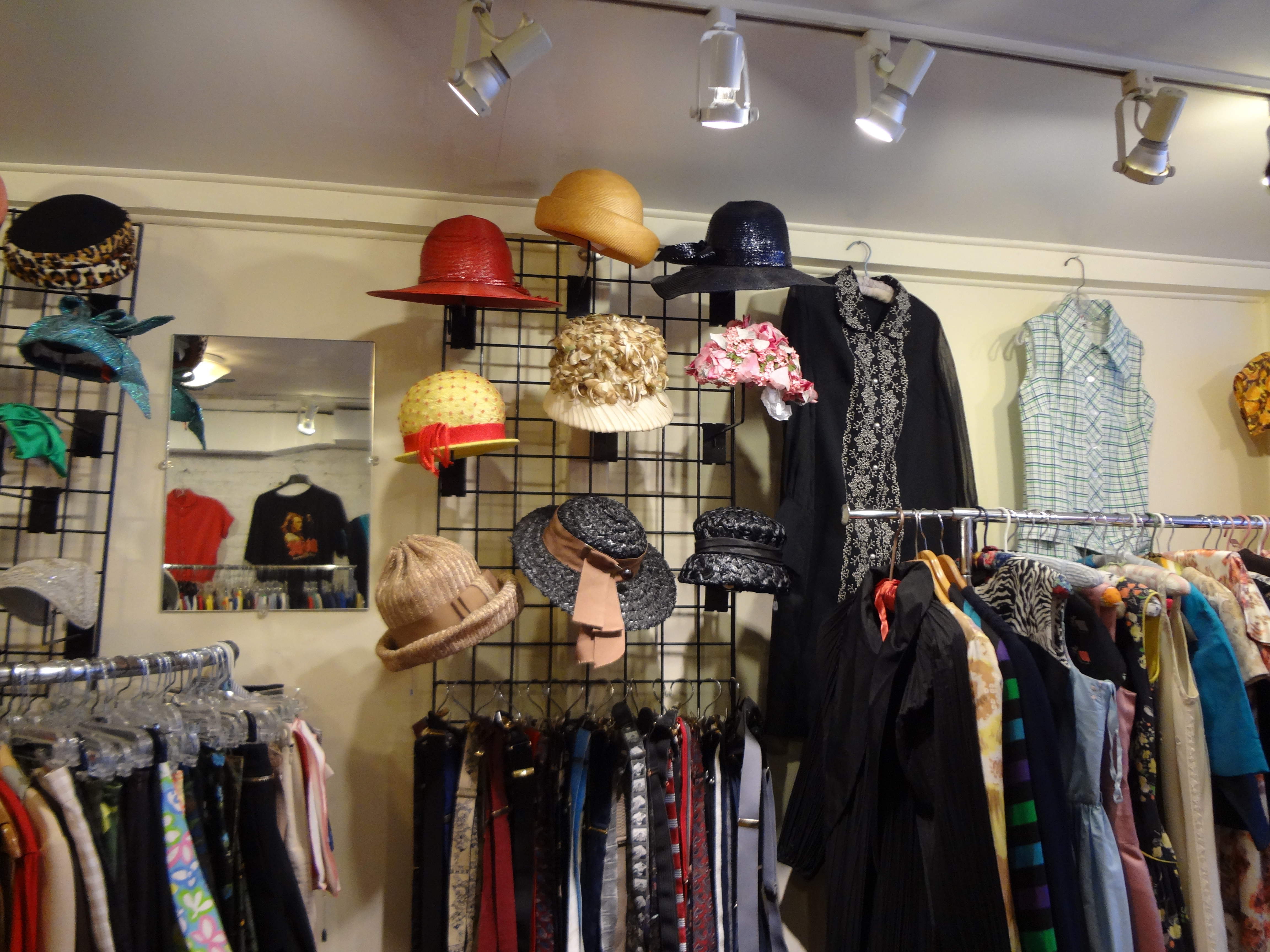 For women’s wear there is a lovely variety of dresses, skirts, blouses, blazers and coats. Seasonally the shop carries vintage furs, for those of you who like fur coats. There is a lovely collection of hats, for both men and women who collect millinery pieces. For men David keeps a collection of blazers, sports jackets, shirts, slacks and he said many men like to collect apparel with the Playboy bunny logo. His collection of suspenders includes ones with the button hole and those with the clips instead. If you are on a serious budget, there is usually a sales rack, plus there is a basket of ten dollar vintage scarves as well.