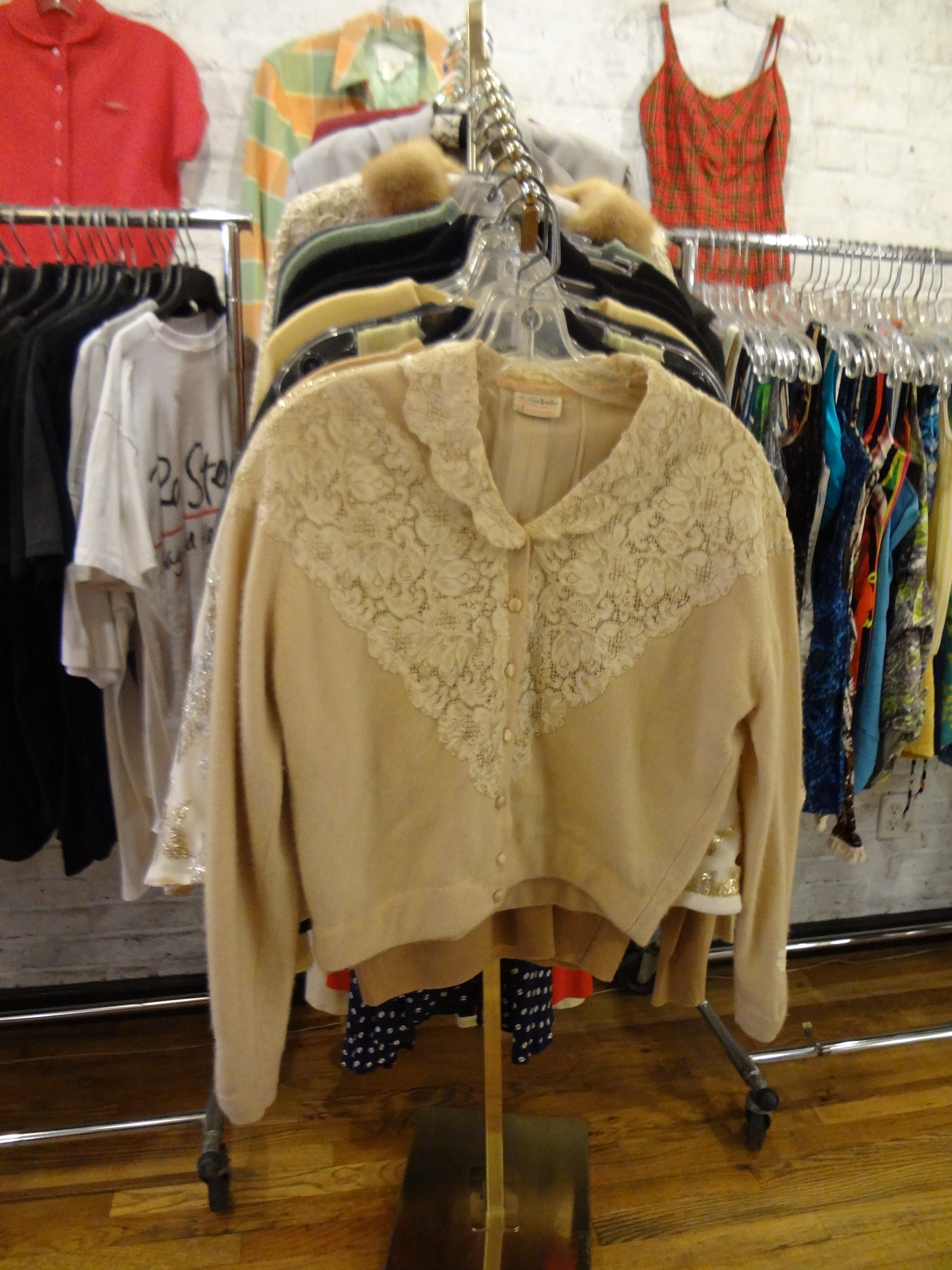 The first time I visited the shop I was impressed with the equal share of men’s and women’s wear, the quality of the merchandise, and the fact that the shop has reasonable prices. Also, the shop is very well organized, and attention to detail is carried over into the merchandise. Generally, anything that needs mending gets sent to the tailor prior to being put out on the sales floor. David also carries a wide array of accessories such as men’s 1940’s neckties, pocket squares, cuff links, bow clips, bow ties and suspenders. For women he has sweater clips, brooches, earrings, necklaces, scarves, and more. He has vintage dead stock sun glasses, hats for men and women, shoes, handbags and numerous other items. There is quite a large collection of men’s Hawaiian print shirts. One of the Hawaiian print shirts he currently has is from the 1940’s made by a company called Kahanamoku. For vintage collectors who like designer name items he has a wide variety, from clothing to accessories. David is in the shop quite often, plus he has a full time manager, Chris, who is there five days a week. Chris has a degree in Fashion Merchandising from the Fashion Institute of Technology. He started working for David during his last semester at school and never left. The sales assistance you will receive there will be friendly, as well as knowledgeable of vintage.