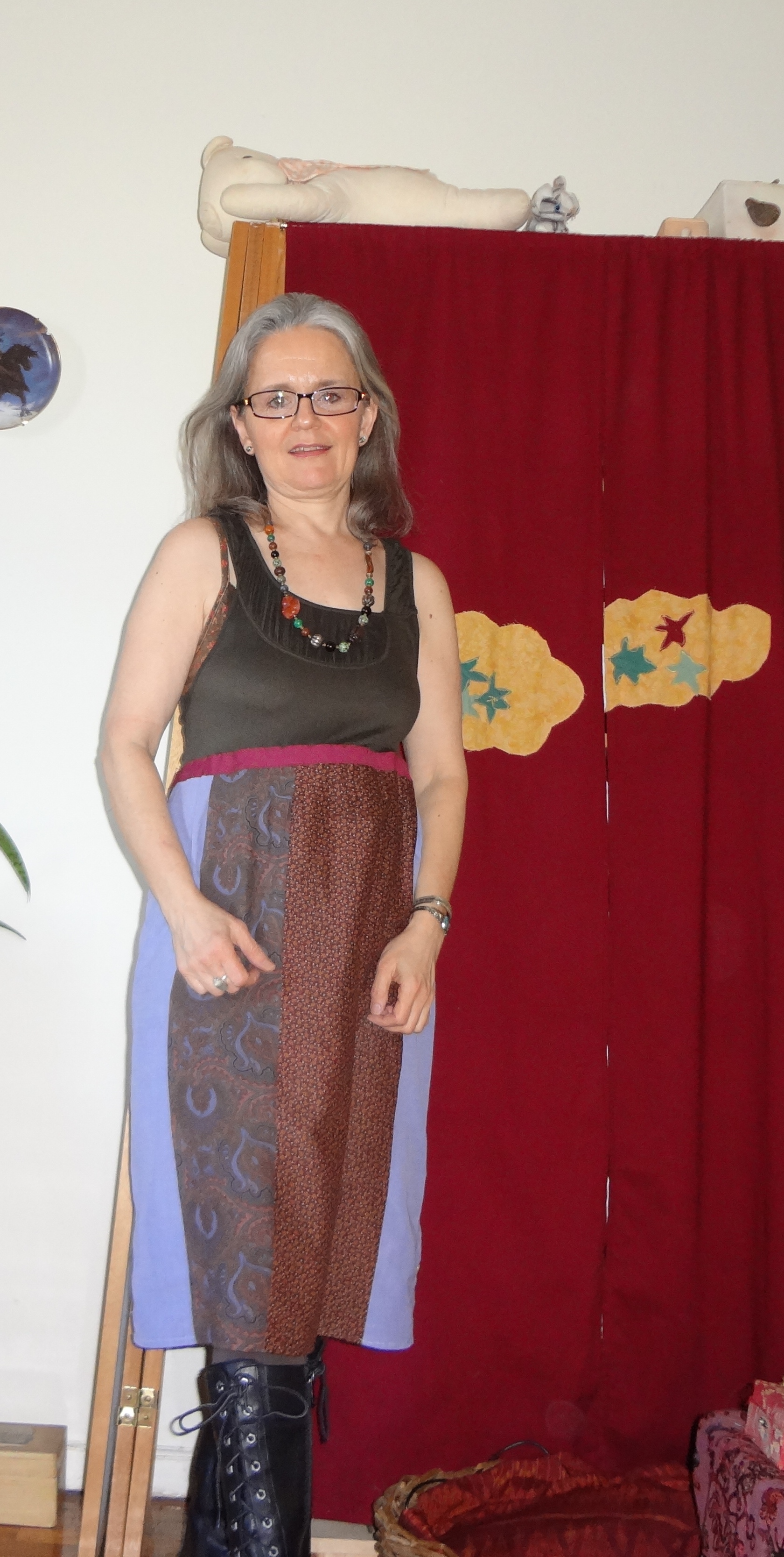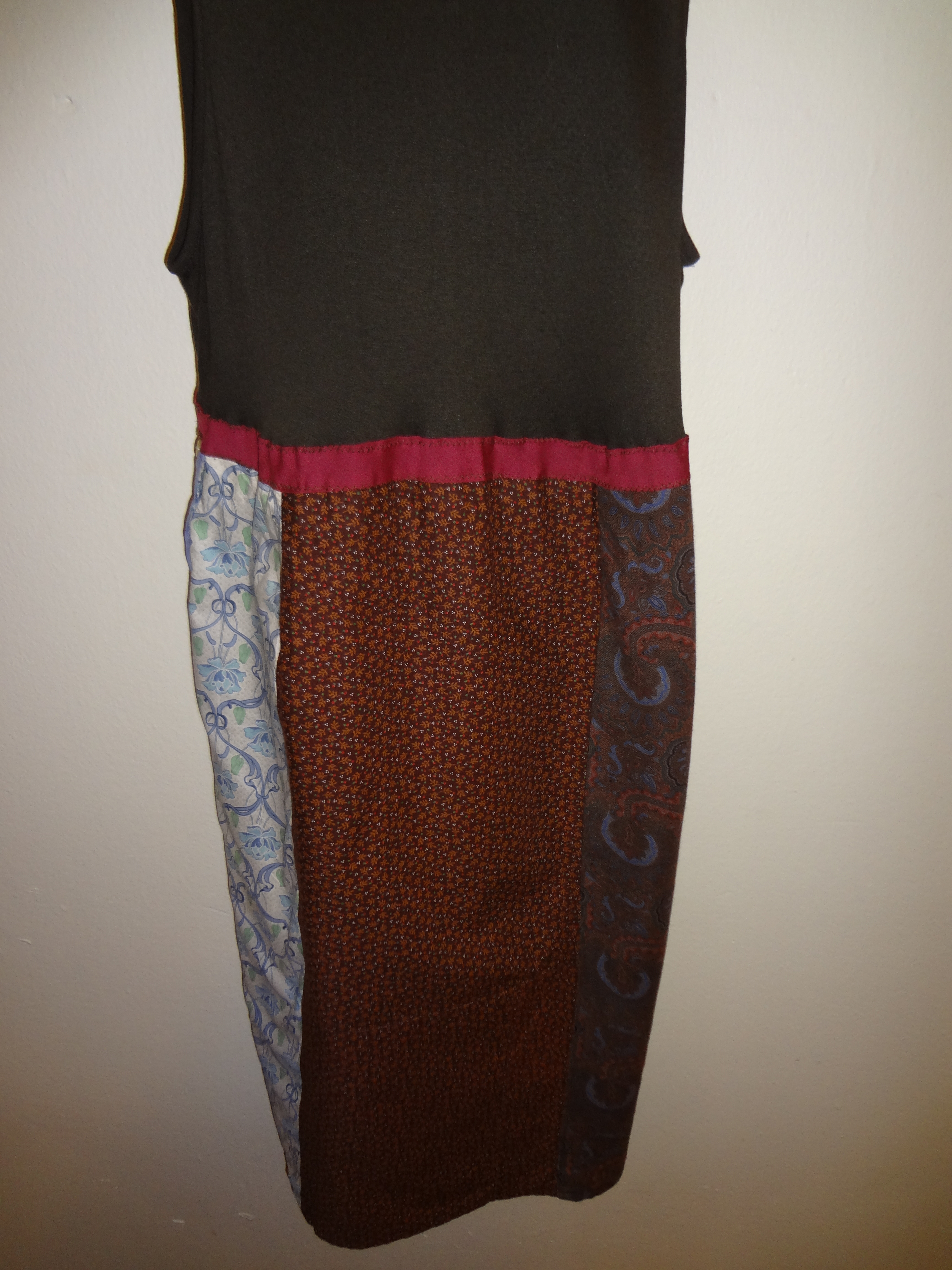 I also did one dress I designed myself out of strips of Liberty of London fabric mixed with a man’s shirt and some calico fabric. I had these small pieces of Liberty of London fabric buried in my closet for years and really wanted to do something fun with them. I patch worked the strips together and took a button down section of a men’s dress shirt and situated that part where it would run down one side of the skirt. I attached the skirt with bodice tape onto a old tank top t shirt that was falling apart below the belly button area. Once all sewn together I was very pleased with my dress. If I wear it with a long sleeve t shirt underneath it I can wear it in the winter.